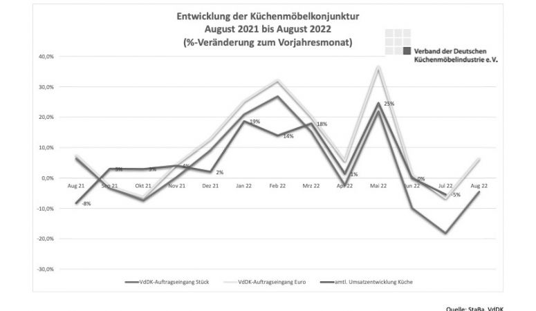 Dank des guten ersten Halbjahrs rechnet die deutsche Küchenmöbelindustrie im Jahr 2022 mit einer positiven Bilanz. Im ersten Halbjahr wuchs der Umsatz um 10,11 Prozent auf 3,62 Mrd Euro an, natürlich auch bedingt durch die Preisanstiege. Der VdDK geht davon aus, dass das gute Auftragspolster die positive Entwicklung bis zum Jahresende stützen wird, aber macht natürlich auf die „aktuell zunehmende Verunsicherung der Konsumenten“ aufmerksam. Maximal bis zu 10 Prozent mehr, so lautet die Prognose fürs Gesamtjahr.
