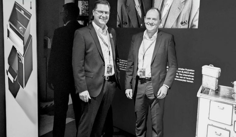 Blancos Noch-CEO Frank Gfrörer, der zum Chef der Dachgesellschaft Blanc + Fischer aufgerückt ist, machte in seiner kleinen Ansprache auch deutlich, dass der Wasserplatz inzwischen viel mehr ist als bloß „Zubehör“. „Wir sind Systemanbieter für den Küchenwasserplatz, den Ort, an dem sich Menschen mehr aufhalten als irgendwo anders in der Küche“, so Gfrörer in Rödinghausen.